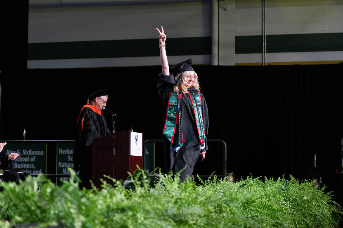 Following the commencement address, Dr. Michael Urick, C’04, dean of the McKenna School; Dr. Stephen Jodis, dean of the Boyer School; and Dr. Elaine Bennett, dean of AHSS, conferred the degrees in course for graduates from their respective schools.