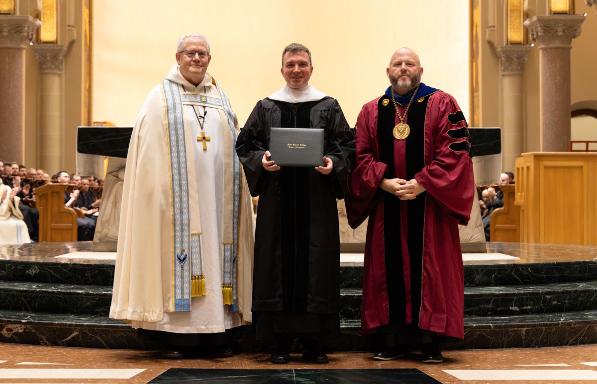 Deacon Tyler Fitzgerald of the Diocese of Ogdensburg, New York, was presented with the Diakonia Award by the Very Rev. Edward Mazich, O.S.B., S’98, SSL, STL, DPhil, rector of Saint Vincent Seminary. This award honors a fourth-year seminarian who exhibits outstanding academic performance, service to the Seminary community and creative outreach to others.