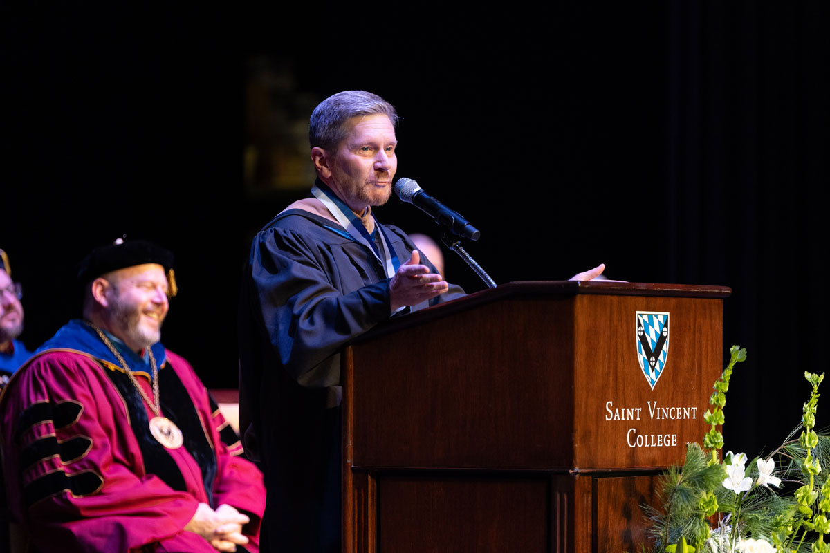 “As bullish as I am on technology, there are things that AI will never replace: trust and honesty. These are most important to my success; more important than any technical knowledge I've gained,” he continued. “My success was fueled by how I've treated people and how I built trust. Sounds simple, but it often can be hard to be honest when something is your fault, to speak the truth when it's unpopular, to provide people with difficult yet constructive feedback. AI is not going to replace integrity. The integrity you learned on this campus, how you treat people, how you conduct yourself, is your unautomated, irreplaceable superpower. Take it with you. Use AI, ride the wave of technology, but build your career on the foundation of trust … please take Saint Vincent's community with you. I have.”