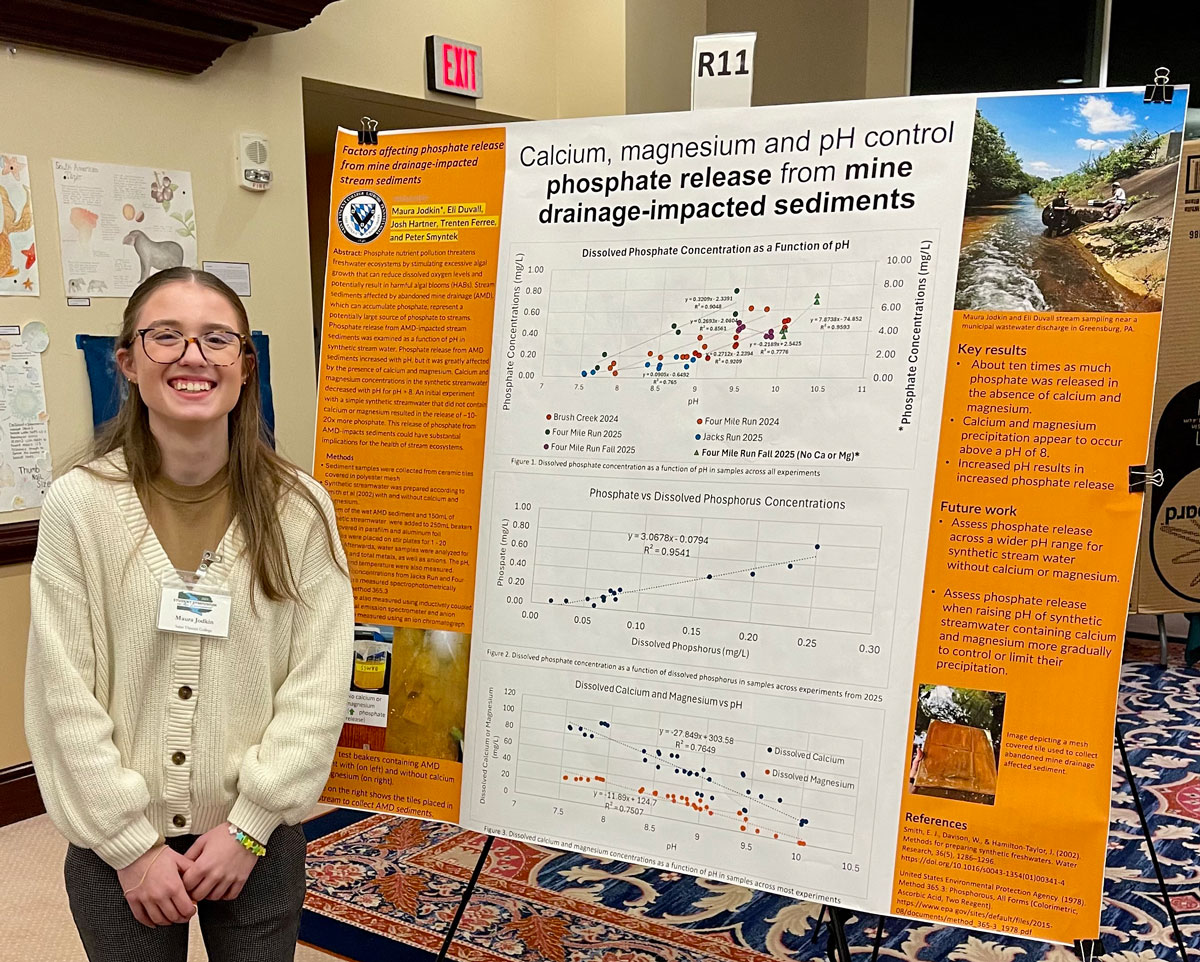 The research poster was a result of Jodkin’s internship from May-June 2025 on local water quality issues alongside Dr. Peter Smyntek, an associate professor of environmental education and biological science in the Herbert W. Boyer School of Natural Sciences, Mathematics and Computing at the College. Jodkin’s presentation was titled “Factors affecting phosphate release from mine drainage-impacted stream sediments.”