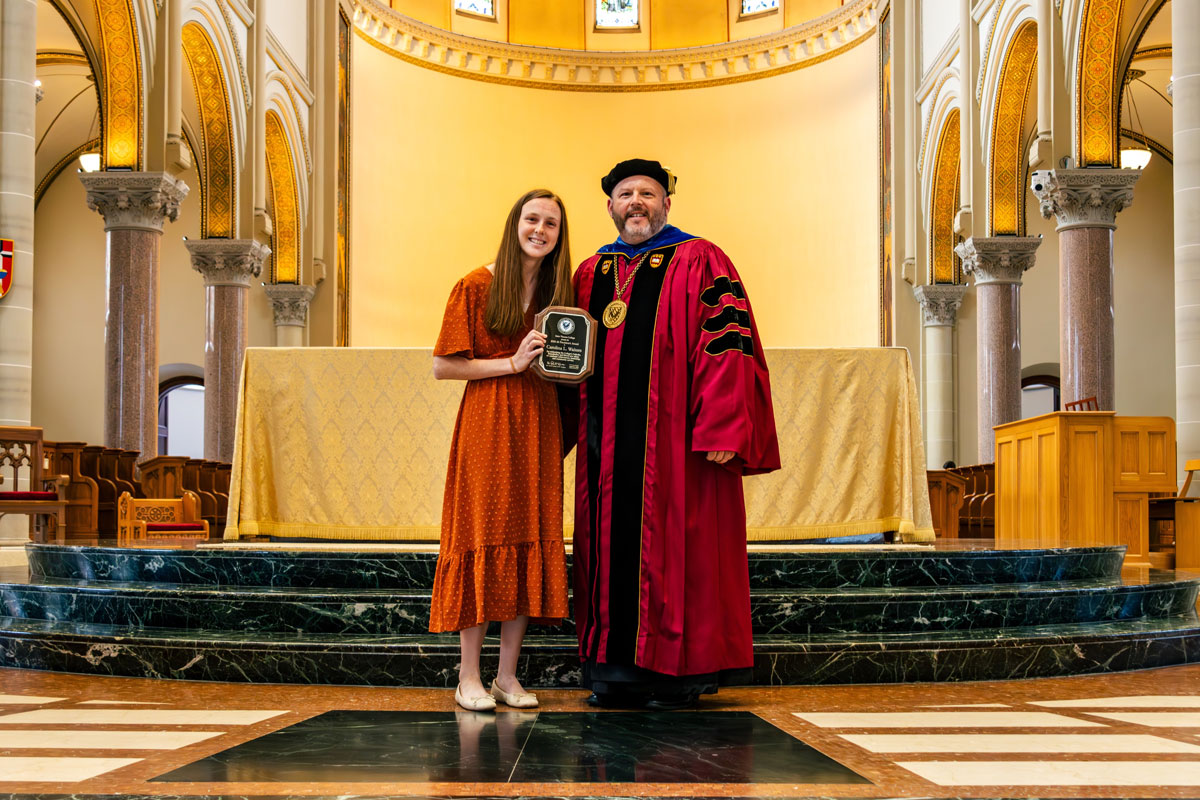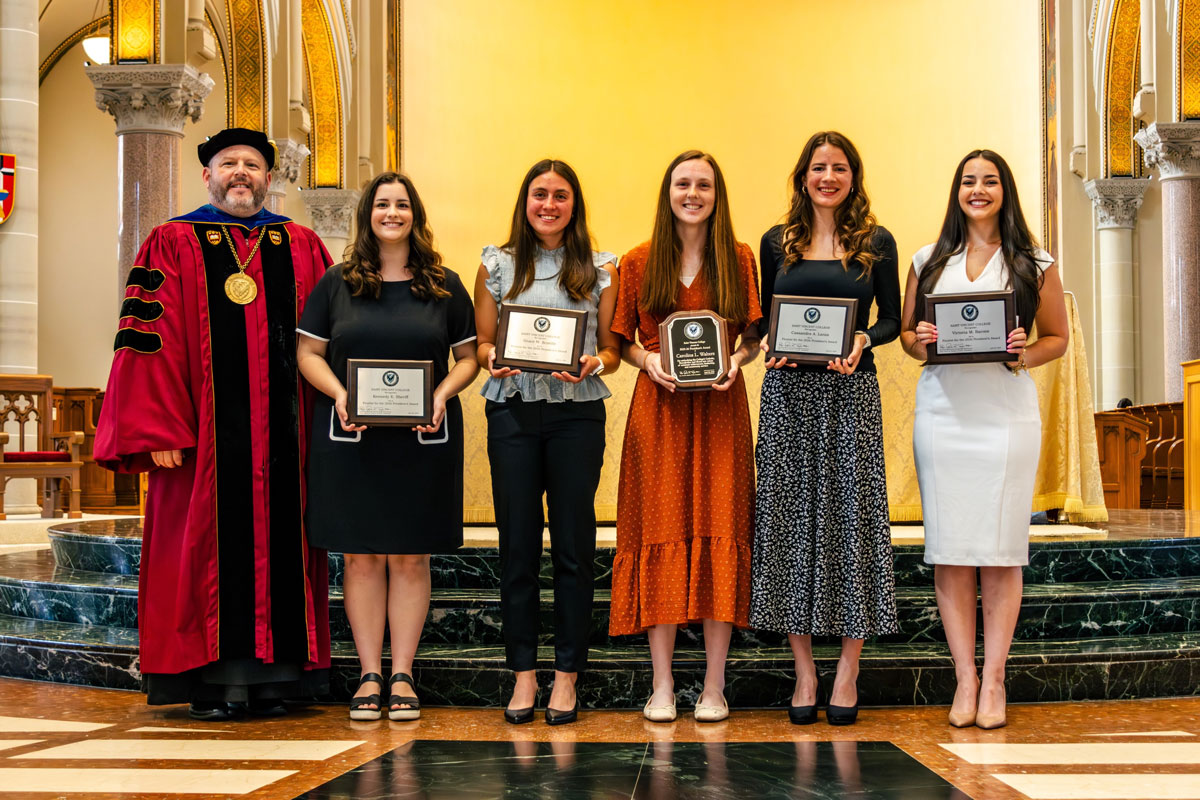 Other awards included the Honorable Judge Bernard Scherer Award, which was presented to Deacon Brian Myler, S 26; the John and Theresa Ragan Poetry Award, which was presented to senior Sophia M. Nelson; the Class of 1968 Fr. Ronald R. Gorka Scholarship Award, which was presented to junior Iverson A. Agyei, with juniors Katherine L. Folmar and Rachel S. Zgurich as runners-up; and the SGA Senior Awards, which were presented to Colt R. Easterling, Andrew Gelin, Lindsey E. Moretti, Julie L. Peterson and Braden M. Thomas. Junior John F. Quinn and senior Kaitlin M. Waltman were the 2025-26 Elizabeth and Tom Andreoli Traveling Scholar awardees.